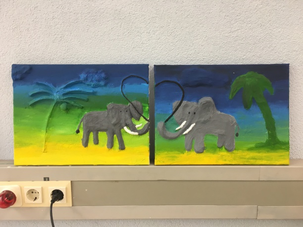 The Children create 3D-Pictures with Paper and Acrylcolor, Two Girlfriends made this two Elephants.