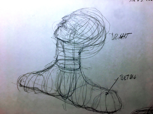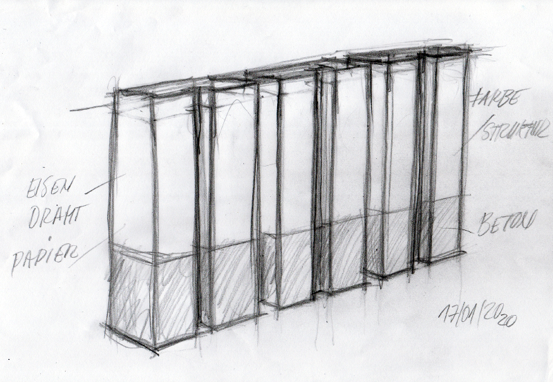 Coloured Pencil and Fineliner on paper / First Sketches, Detailview to new ironwire and concrete sculpture / 09/2020